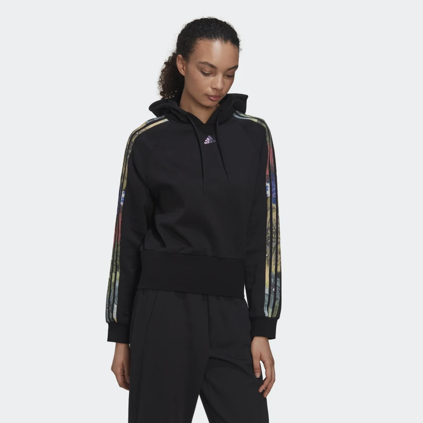 Detalji: Kapuljača sa podešavanjem vezicama, rebrasti manžetni i donji rub, floralni print sa 3-Stripes elementima, iridescent Badge of Sport