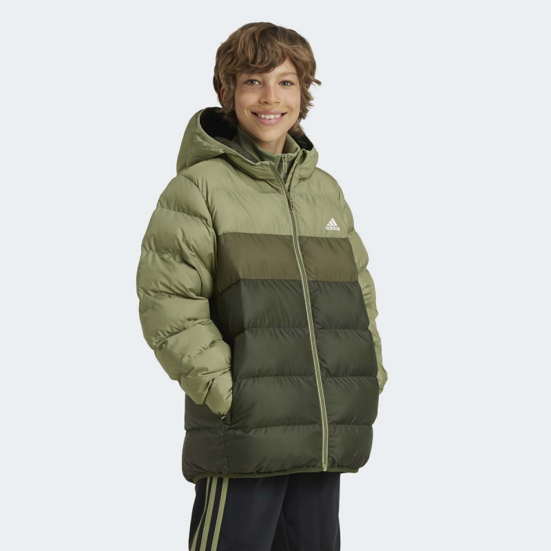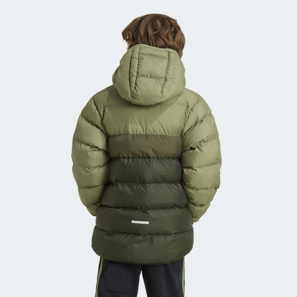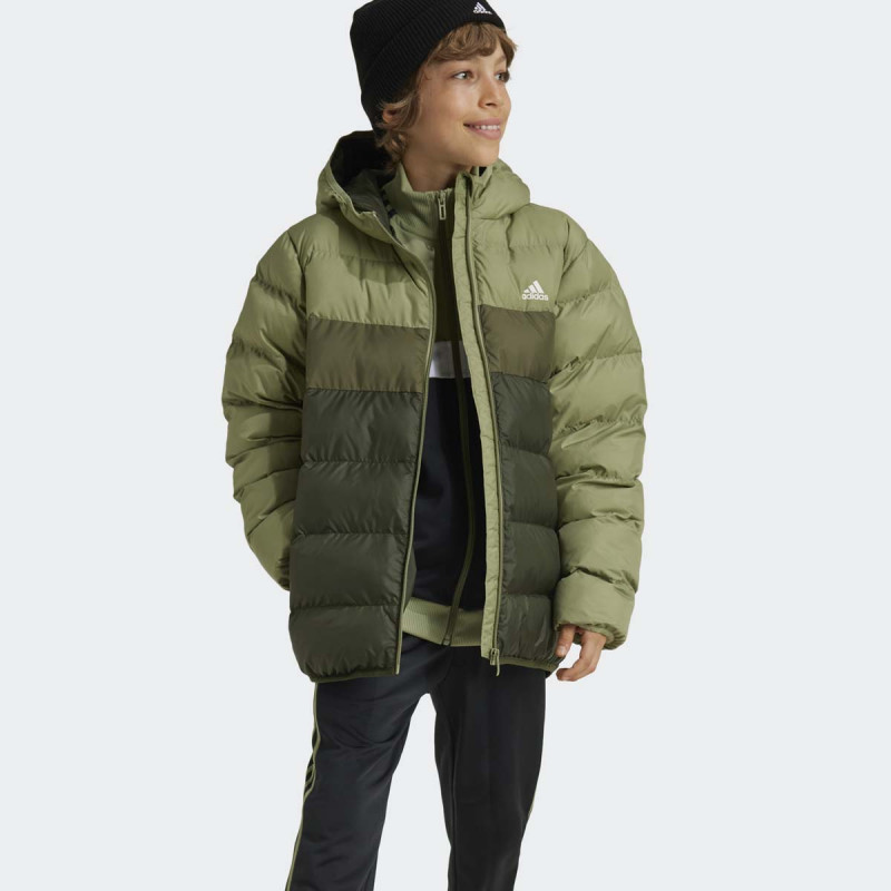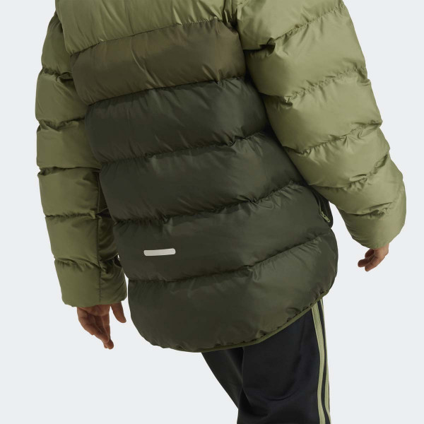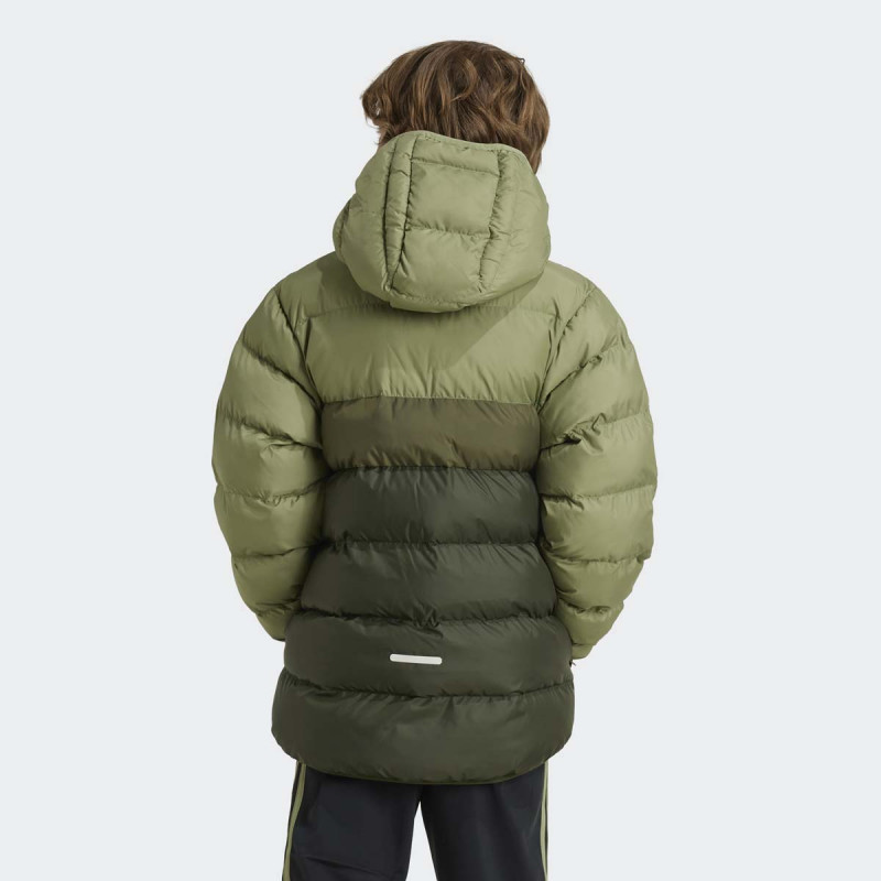 Adidas Synthetic Down Jacket je zimska jakna za dečake i devojčice koja pruža izuzetnu toplinu i udobnost, a sve to bez viška težine. Napravljen od 100% recikliranog poliesterskog materijala, ovaj kaput koristi sintetičko perje za odličnu izolaciju, čime je idealan za hladne zimske dane. Jakna ima moderan dizajn sa reflektivnim detaljima koji povećavaju vidljivost u tamnijim uslovima. Svojim praktičnim džepovima sa rajsferšlusima i kapuljačom, pruža dodatnu zaštitu od hladnoće.