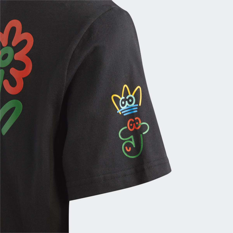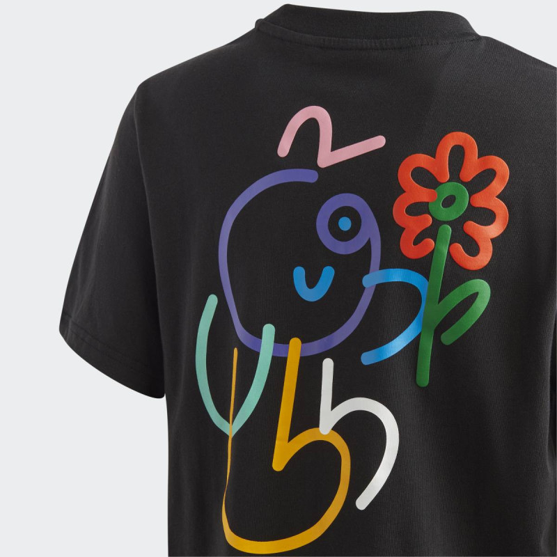 Ova juniorska adidas majica je deo kolaboracije sa britanskim umetnikom James Jarvisom. Na leđima se nalazi originalna ilustracija njegovog karaktera, sa apstraktnim oblicima i živopisnim bojama, koja unosi radost i vedrinu u svakodnevni stil. Print je izrađen tako da se ističe na crnoj osnovi, a majica kombinuje udobnost i moderan dizajn, idealna za svakodnevno nošenje.