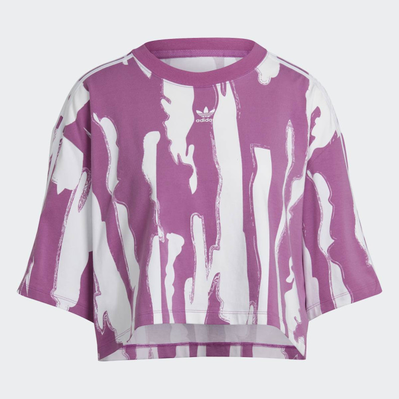 Ova ženska cropped majica nastala je u saradnji sa južnoafričkom modnom kućom Thebe Magugu. Eksperimentalni psihodelični print, koji je prvobitno dizajnirao tradicionalni iscelitelj u Lesotu, donosi šarene '70s vibracije. Majica je oversize kroja i pruža ležernu, ali kreativnu i izražajnu estetiku