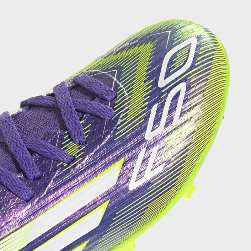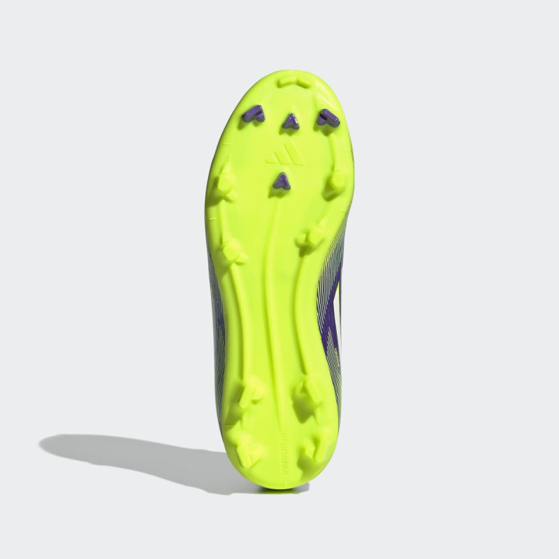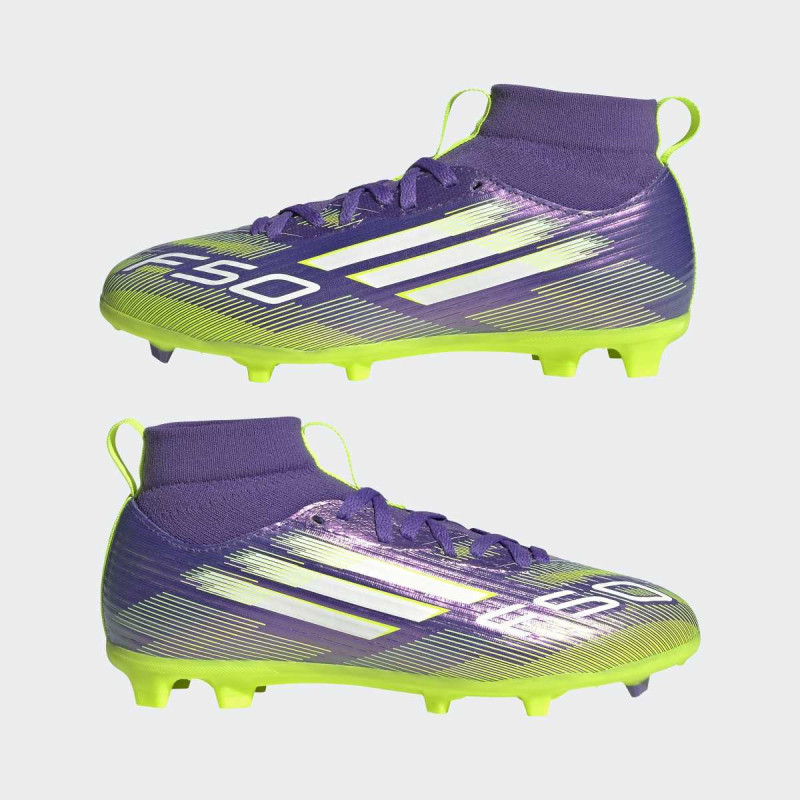 adidas F50 League Mid kopačke za juniore dizajnirane su za brzinu i preciznost na terenu. Mid-cut kroj pruža stabilnost oko gležnja, dok Fiberskin gornji deo sa strateški postavljenim 3D linijama poboljšava kontakt sa loptom i vizualni izgled. Lagani TPU Sprintplate 360 potplat sa kombinacijom sečivastih i polukoničnih čepova omogućava agilnost i brzinu u svim pravcima. Delimično su izrađene od recikliranih materijala, spajajući performanse i održivost. Savršene za fudbalske treninge i utakmice na čvrstoj ili mešovitoj podlozi.