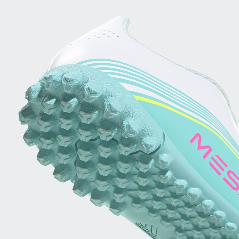 Patike F50 Messi Club Turf su kreirane za mlade fudbalske entuzijaste koji žele da igraju brzo i agilno. Dizajnirane prema preferencijama Lionela Messija, ove patike nude lagani gornji deo od sintetičkog materijala i “floating” jezik sa rupicama za dodatnu ventilaciju, što održava stopala svežim tokom igre.