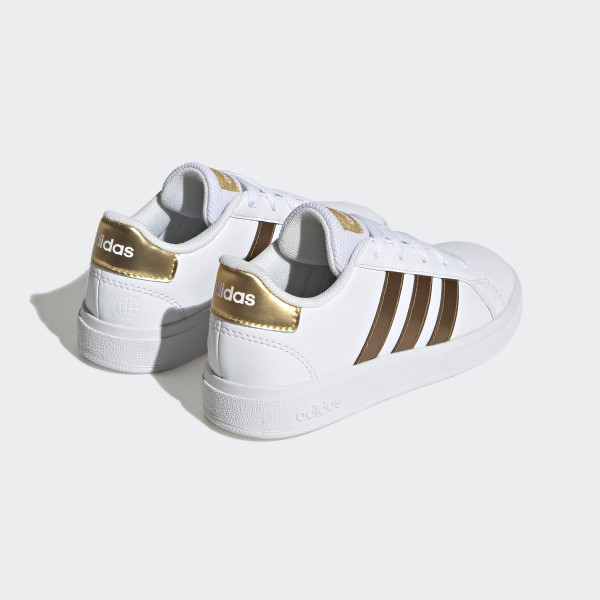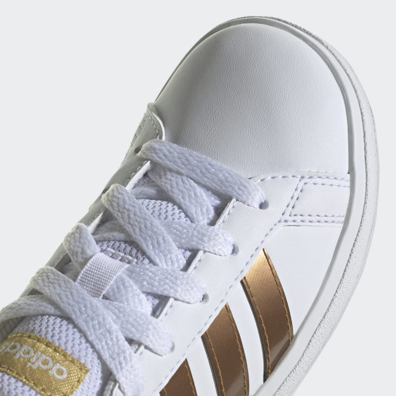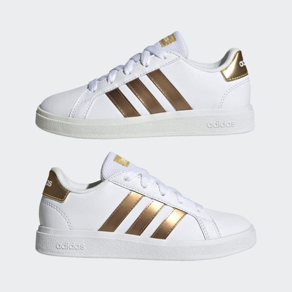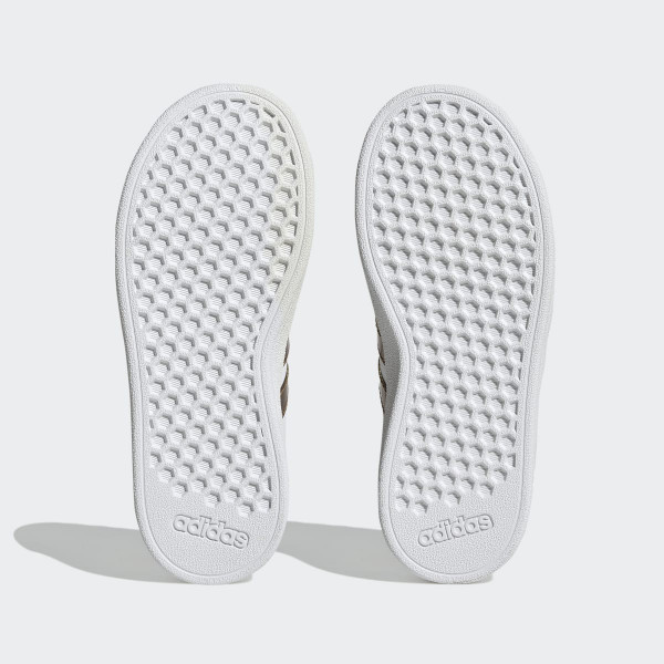 Ove adidas patike za decu inspirisane su najpoznatijim teniskim modelima. Sjajni metalik detalji na trima linijama, peti i jeziku daju klasičnom dizajnu moderan sjaj. Cloudfoam srednji đon pruža izuzetnu udobnost pri svakom koraku, idealno za decu u pokretu. Gornji deo je izrađen od izdržljive sintetičke kože i sadrži najmanje 50% recikliranog materijala, kao deo adidas inicijative za smanjenje plastičnog otpada.