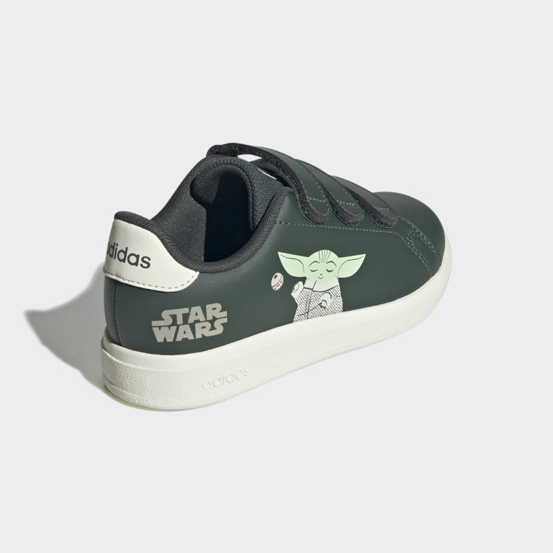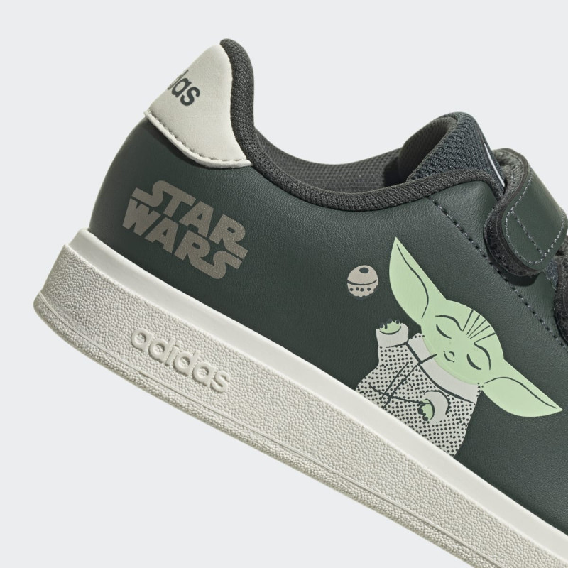 Adidas Star Wars Advantage Mandalorian patike za decu kombinuju zabavu i funkcionalnost. Sa regularnim krojem i lakim hook-and-loop zatvaranjem, omogućavaju brzo i jednostavno obuvanje za male avanturiste. Grafika Grogu-a (Baby Yoda) i Mandalorian detalji na bočnoj strani čine ove patike pravim hitom među mladim fanovima. Gornjište od tekstila i sintetičkih materijala pruža izdržljivost i udobnost, dok gumeni đon obezbeđuje siguran hod. Delimično izrađene od recikliranih materijala, ove patike su i ekološki prihvatljive.