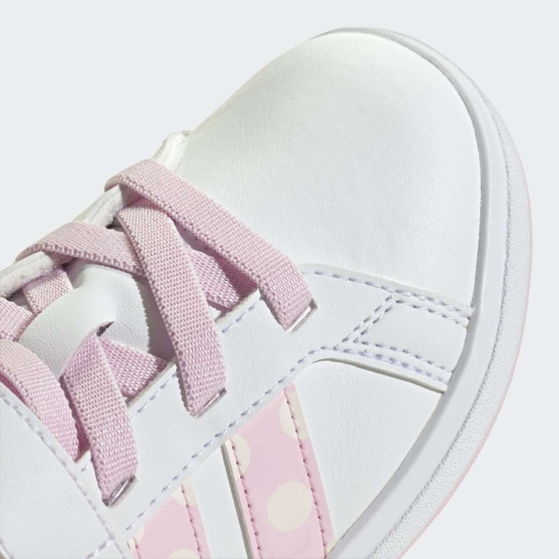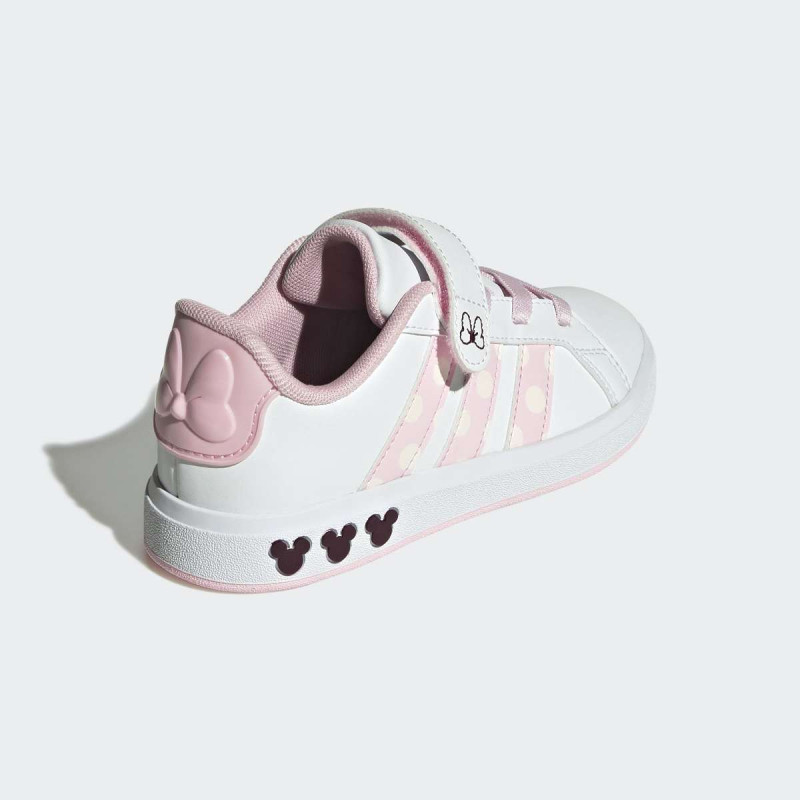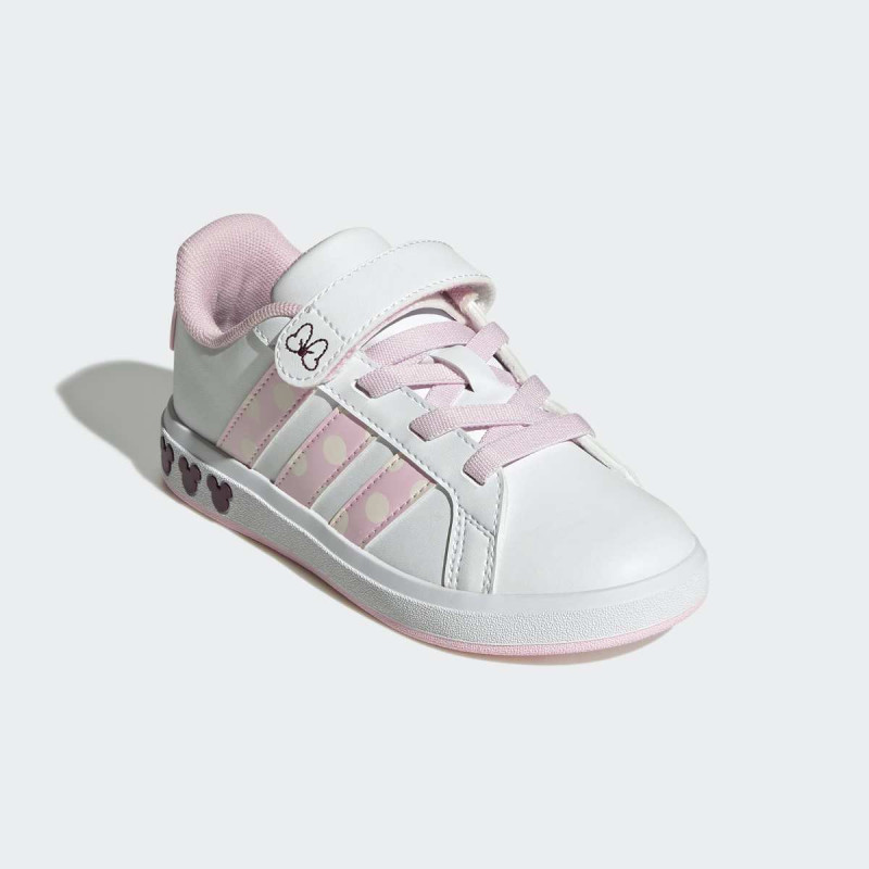 Adidas Disney Minnie Mouse Grand Court patike za decu su inspirisane klasičnim Grand Court modelom i dizajnirane za mališane koji vole zabavu i stil. Gornji deo je od Primegreen reciklirane sintetike, sa detaljima poput 3D Minnie glave na peti i Minnie grafike sa strane. Elastične pertle i čičak trake omogućavaju lako obuvanje i sigurnu potporu za male noge. Idealne su za svakodnevne igre, šetnje i aktivnosti u parku, kombinujući udobnost, izdržljivost i prepoznatljivi Disney šarm.
