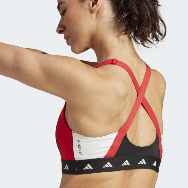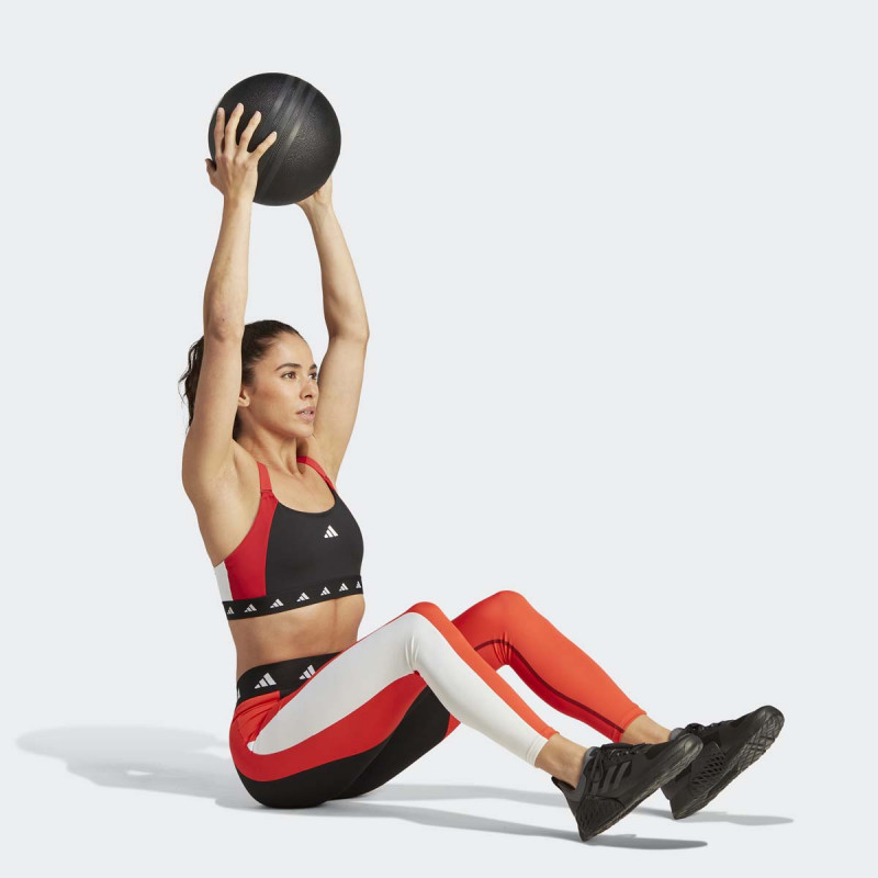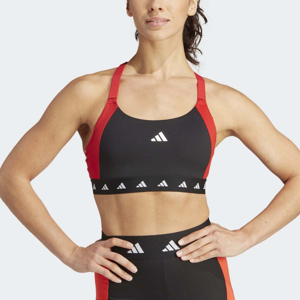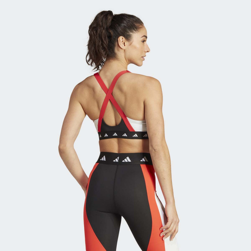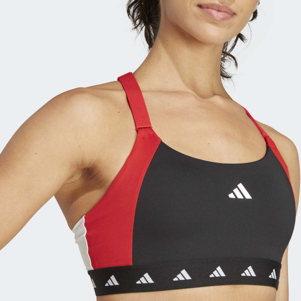 Ovaj adidas sportski grudnjak srednje podrške idealan je za sve vrste treninga poput HIIT sesija, vožnje biciklom, boksa i timskih sportova. Izrađen je od recikliranih materijala, s naglaskom na održivost i funkcionalnost. AEROREADY tehnologija omogućava zadržavanje suvoće i udobnosti, dok je dodatni komfor osiguran podesivim naramenicama i uklonjivim umecima. Dizajn je u boji crne, bele i crvene, sa elegantnim detaljima i sportskim logotipima. Grudnjak pruža dobar oblik i podršku bez obzira na intenzitet treninga, dok mesh detalji omogućuju dodatnu prozračnost.