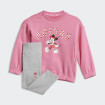 adidas Disney Minnie Mouse Jogger Set je idealan za male devojčice koje žele da u svom garderoberu imaju zabavu i stil. Set se sastoji od udobne majice sa ribanim okovratnikom i elastičnim manžetnama, kao i helanki sa elastičnim pojasom. Majica je izrađena od pamuka sa elastanom, dok su helanke od pamuka i recikliranog poliestera. Dizajn uključuje Minnie Mouse grafiku na prednjem delu majice, zajedno sa šarenim polka tačkama i gliter efektima, koji dodaju dašak zabave i sjaja. Ovaj komplet je savršen za sve aktivnosti, bilo da se igraju, istražuju grad ili uživaju u svakodnevnim avanturama.